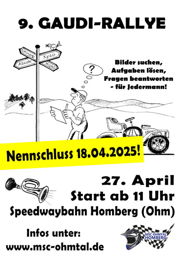Der MSC Ohmtal freut sich auf die GAUDI-Rallye und hofft auf viele Interessierte Teilnehmer, damit die Veranstaltung noch erfolgreicher wird! Wir wünschen allen Teilnehmern viel Spaß und Erfolg beim Bewältigen der GAUDI-RALLYE!