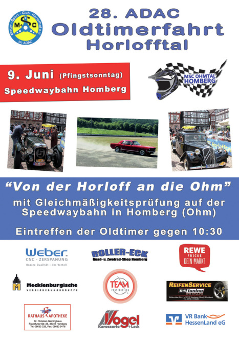 Der MSC Ohmtal e.V. im ADAC ist gerne wieder mit von der Partie und unterstützt die Oldtimerfahrt des MSC Horlofftal zum zweiten Mal. Die Homberger organisieren auf Ihrer Speedwaybahn eine Gleichmäßigkeitsprüfung für die rund 150 Oldtimer und sorgen natürlich für die gute Verpflegung von Besuchern und Teilnehmern.
